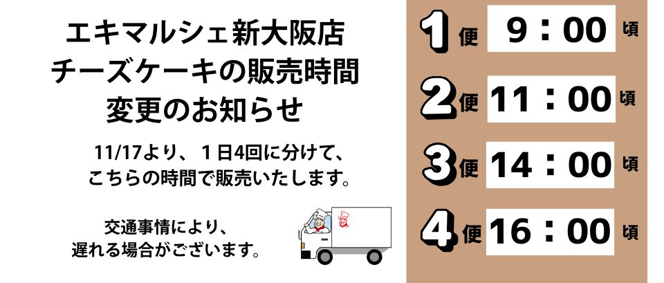 エキマルシェ新大阪店チーズケーキ販売時間変更について