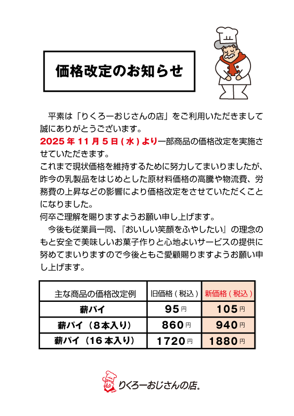 薪パイ価格改定について いつもりくろーおじさんの店をご利用いただき誠にありがとうございます。2025年11月5日(水)より薪パイの価格改定をさせていただきます。何卒ご理解を賜りますようお願い申し上げます。 2025/10/28 14:49