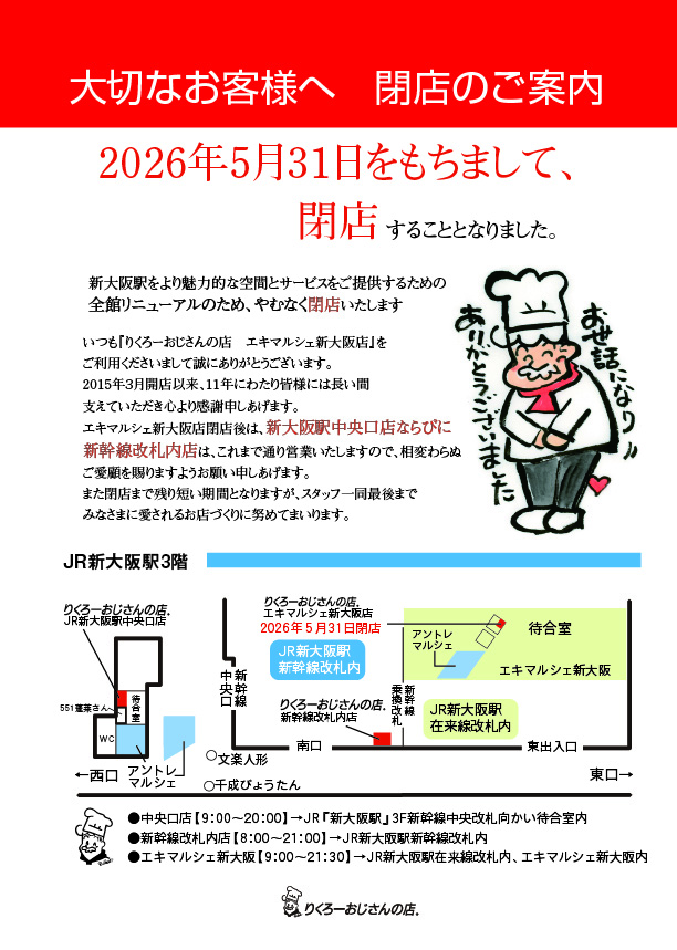 エキマルシェ新大阪店閉店のお知らせ いつもりくろーおじさんの店 エキマルシェ新大阪店をご利用いただき、誠にありがとうございます。この度、2026年5月31日をもちまして新大阪駅の全館リニューアルのため、やむなく閉店することとなりました。 2026/04/18 11:48
