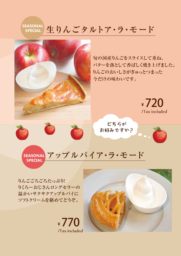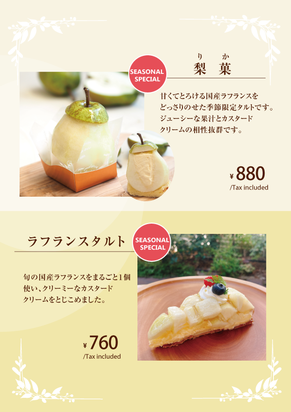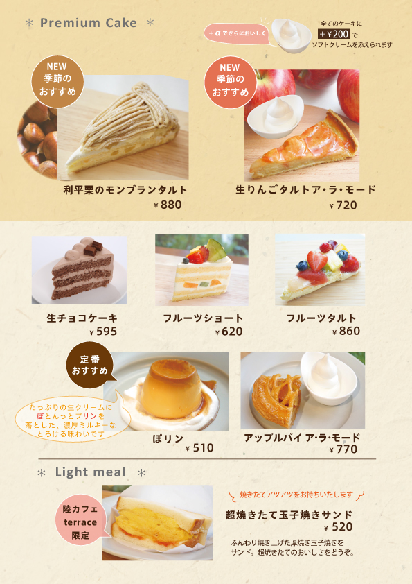 ↓季節のケーキ(10/16~のメニューです。)(※状況により変更になる可能性がございます) ↓季節のケーキ(11/1~のメニューです。)(※状況により変更になる可能性がございます)↓※チーズケーキ・ドリンクメニューはこちら↓