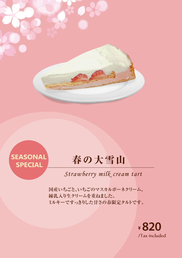 ↓季節のケーキ(2/1~のメニューです。)(※状況により変更になる可能性がございます)↓※チーズケーキ・ドリンクメニューはこちら↓